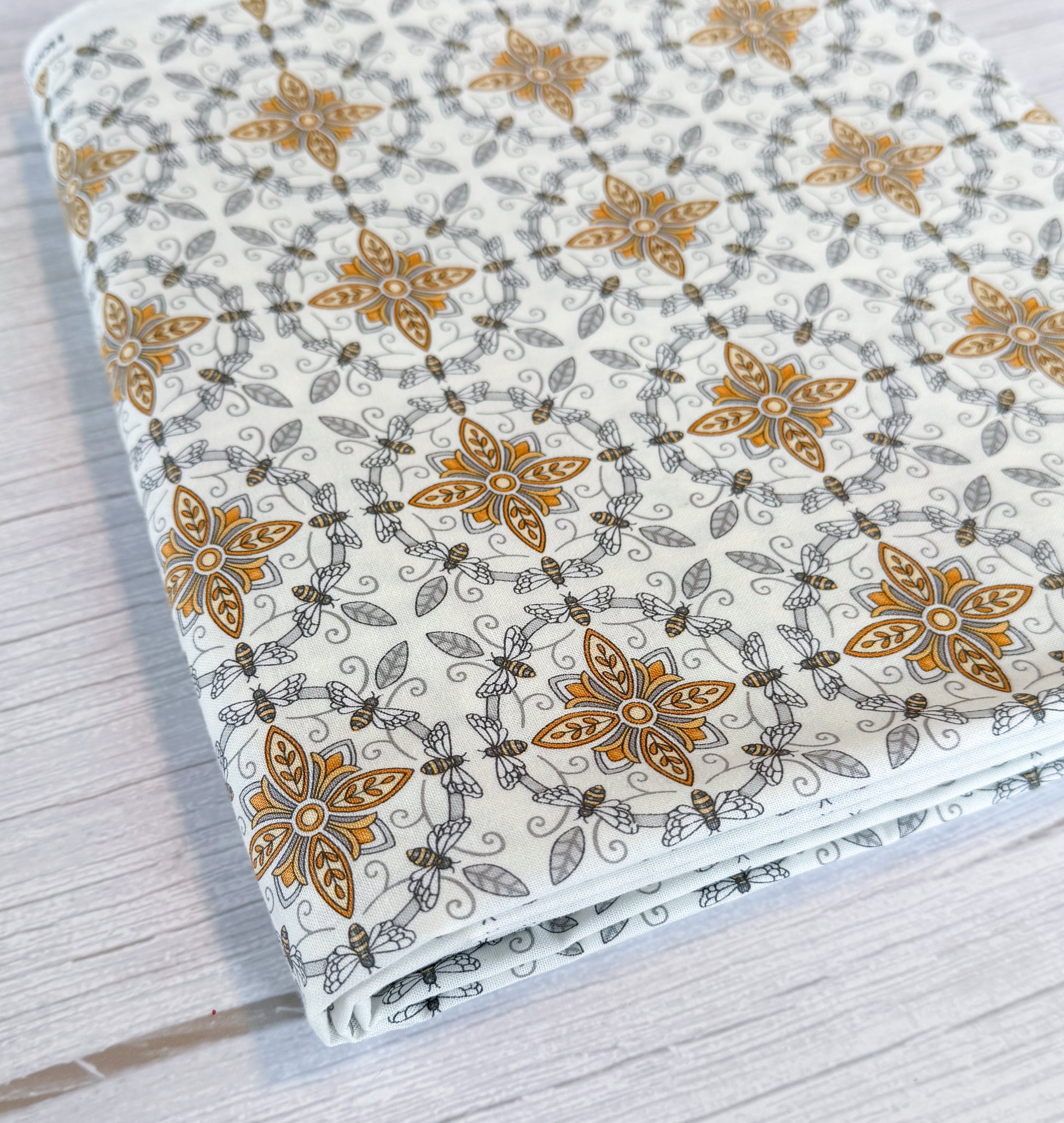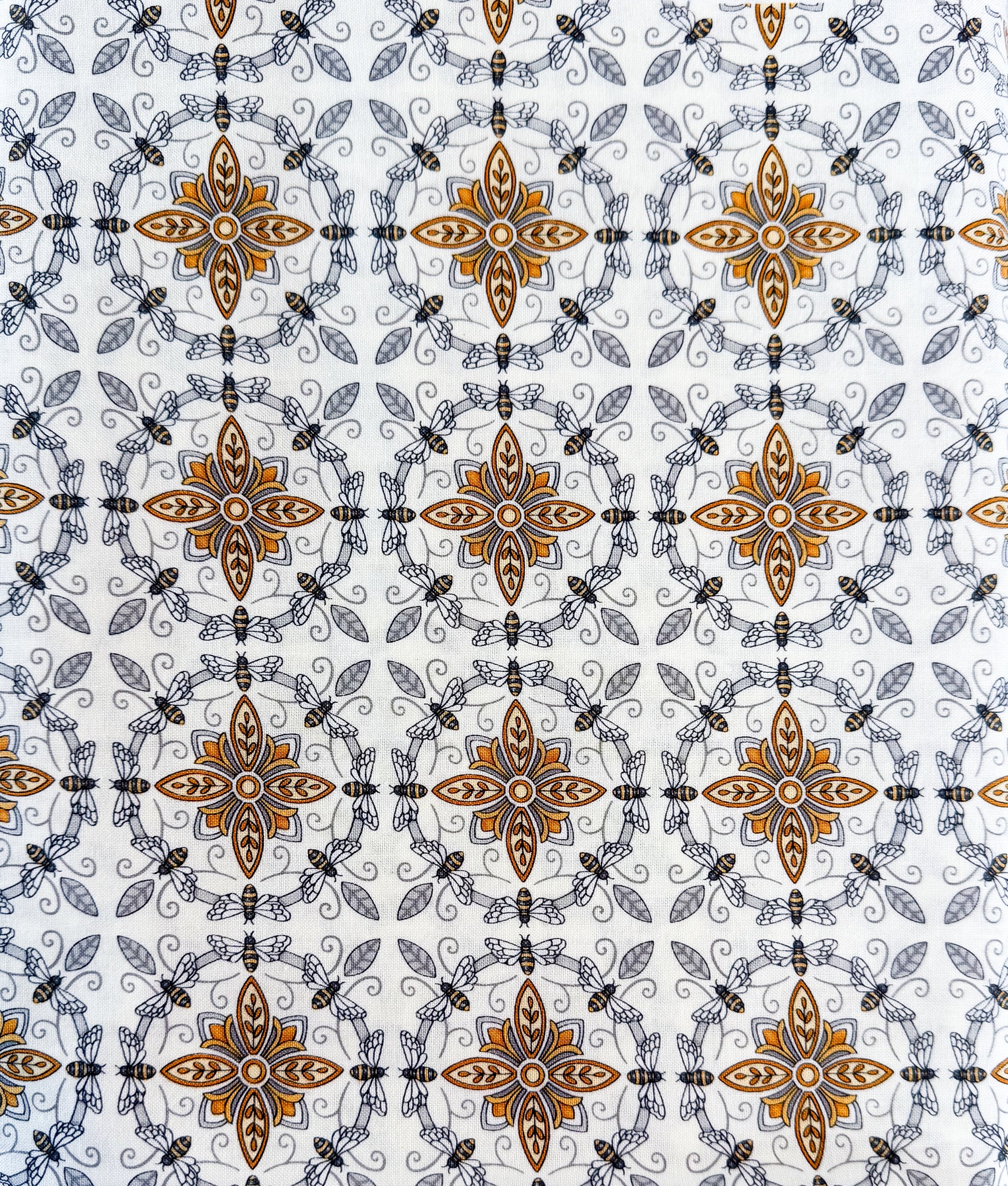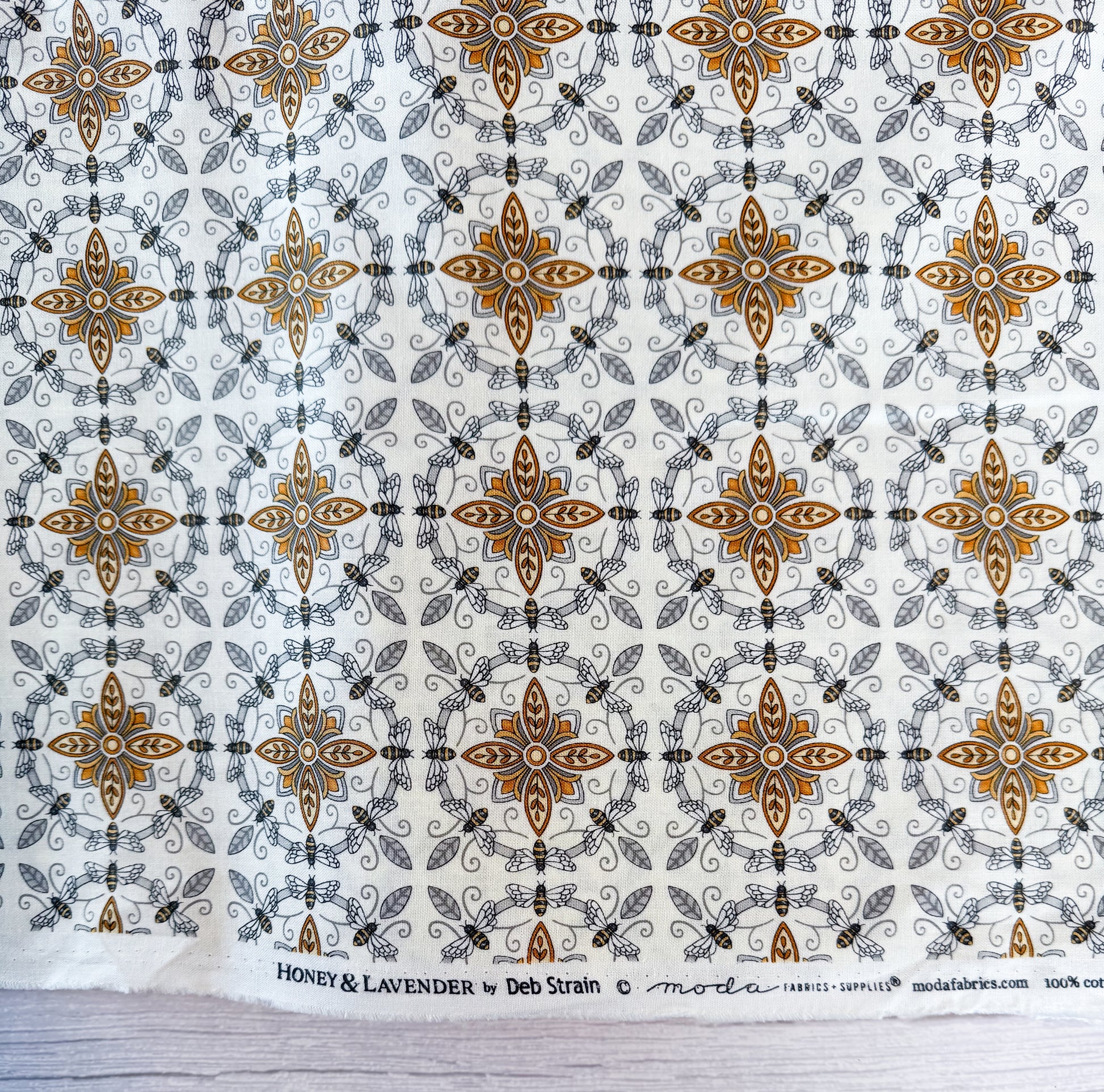 Moda Fabrics 100% cotton. White fabric with gold and grey honey bee medallions by Deb Strain